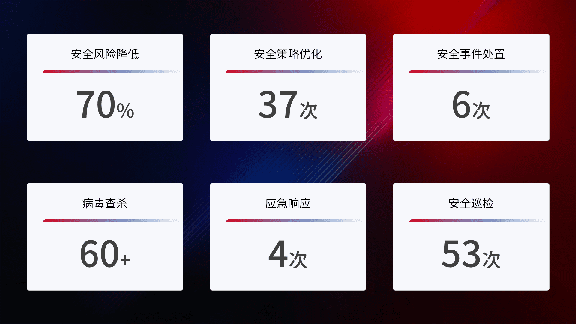提供全面的安全事件报告体系,,,包括处置报告、、周报、、、季度和年度总结,,结合持续监控,,,帮助客户深入了解网络安全状况。。。